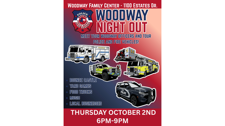 Woodway Night Out is almost here! Join us on Thursday October 2nd from 6 p.m. –9 p.m. for an evening of community fun. Come meet our officers and take guided tours of fire trucks, police cars, and specialized units including K9, Drone Team, and SWAT. Families can enjoy free snacks, food trucks, a bounce castle, music, and yard games. It’s the perfect opportunity to come together, meet your neighbors, and build stronger connections with the officers who serve our community. Be on the lookout for more details to come!