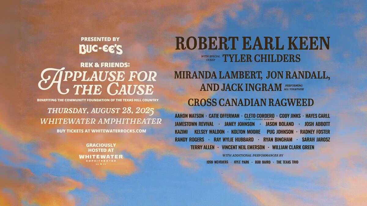 The fundraising efforts for victims of the July 4th flooding in the Texas Hill Country are continuing into August when Texas music legend Robert Earl Keen will be joined by Miranda LambertJack IngramJon Randall and more for Robert Earl Keen and Friends: Applause for the Cause.